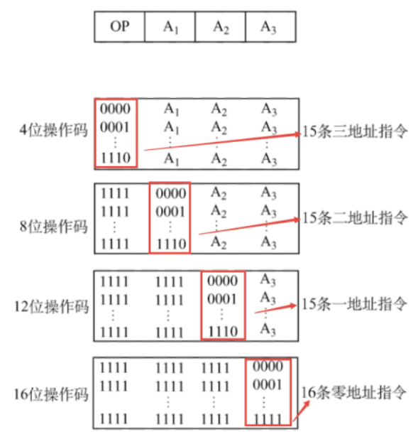- 零地址指令:仅有操作码op,没有显式地址。 如:空操作,停机,中断