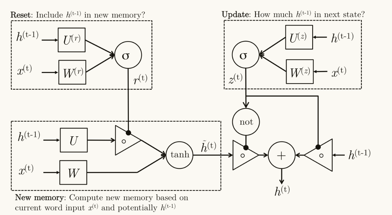 \begin{gathered}\mathrm{Z}{t}=\sigma(W^{(z)}x{t}+U^{(z)}h_{t-1})\text{(Update gate)}\\mathrm{r}t=\sigma(W^{(r)}x_{t}+U^{(r)}h_{t-1})\text{(Reset gate)}\\tilde{h}{t}=\tanh(r_t\circ Uh{t-1}+Wx_t)\mathrm{(New~memory)}\h_{t}=(1-z_t)\circ\tilde{h}t+z_t\circ h{t-1}\text{(Hidden state)}\end{gathered}