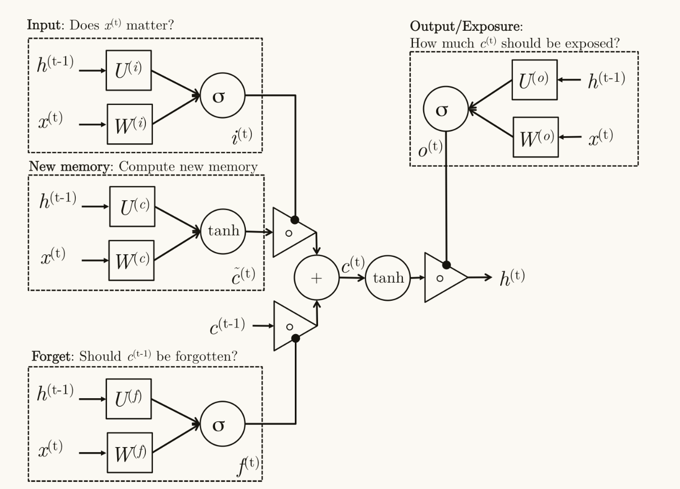 \begin{aligned}&\mathrm{i}t=\sigma(W^{(i)}x_{t}+U^{(i)}h_{t-1})&\text{(Input gate)}\&\mathrm{f}\dot{t}=\sigma(W^{(f)}x_{t}+U^{(f)}h_{t-1})&\text{(Forget gate)}\&\mathrm{o}t=\sigma(W^{(o)}x{t}+U^{(o)}h_{t-1})&\text{(Output/Exposure gate)}\&\tilde{c}t=\mathrm{tanh}(W^{(c)}x_{t}+U^{(c)}h_{t-1})&\text{(New memory cell)}\&c_{t}=f_t\circ c_{t-1}+i_t\circ\tilde{c}t&\text{(Final memory cell)}\&h{t}=o_t\circ\tanh(c_t)\end{aligned}
