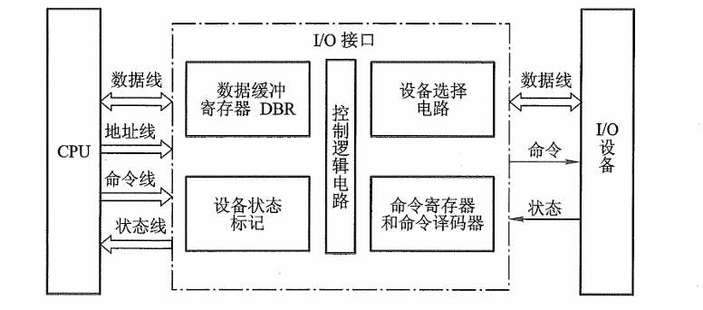 I/O接口中的I/O控制逻辑还要能对控制寄存器中的命令字进行译码,并将译码得到的控制信号通过外设界面控制逻辑送到外设,同时将数据缓冲寄存器的数据发送到外设或从外设接收数据到数据缓冲寄存器。另外,它还要具有收集外设状态到状态寄存器的功能。